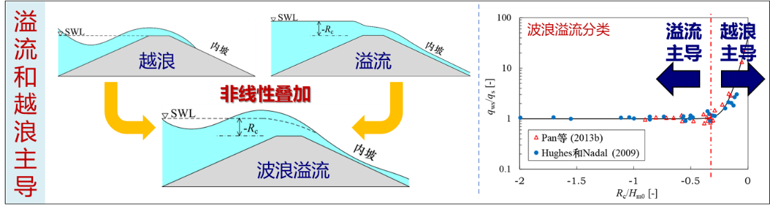 (1)首次建立了大型全比尺海堤波浪溢流物理模型,阐明了极端风暴潮条件下越浪与溢流联合作用引起超强破坏力的主要动力机制;发现了波浪溢流和稳定溢流流量比的拐点,划分了越浪主导和溢流主导的波浪溢流(图1),显著提高了波浪溢流越堤流量的估算精度;提出了极端条件下波浪溢流的科学定义,完善了越浪理论。