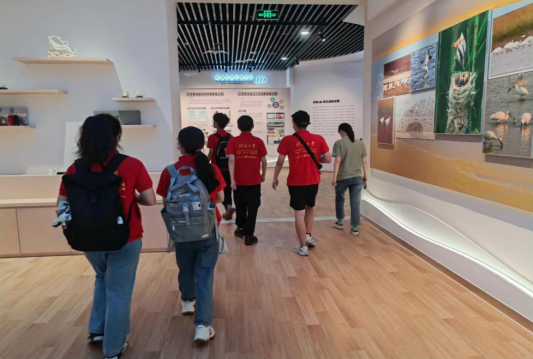 在盐城市湿地和世界自然遗产保护管理中心,队员们参观了湿地展览廊,在细致的讲解中进一步加深对湿地的了解,通过湿地所设监控的实时拍摄画面,观察了麋鹿的生活与栖息的画面,丰富了见闻。