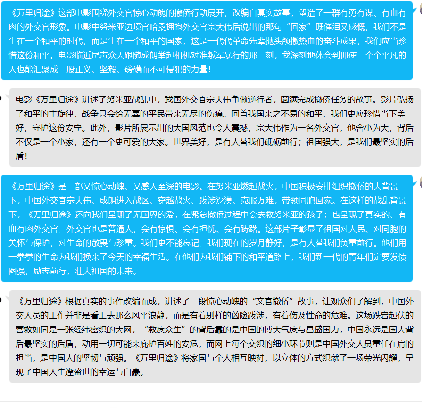 影片《万里归途》讲述了外交官撤侨事件,观影党员无不为外交官不畏艰险、敢于牺牲、英勇顽强的拼搏精神所鼓舞,观影后深感现在美好生活的来之不易,也坚定了勇于担责、敢为人先的信念,坚定了作为一名中共党员为中国人民谋幸福,为中华民族谋复兴的初心使命。