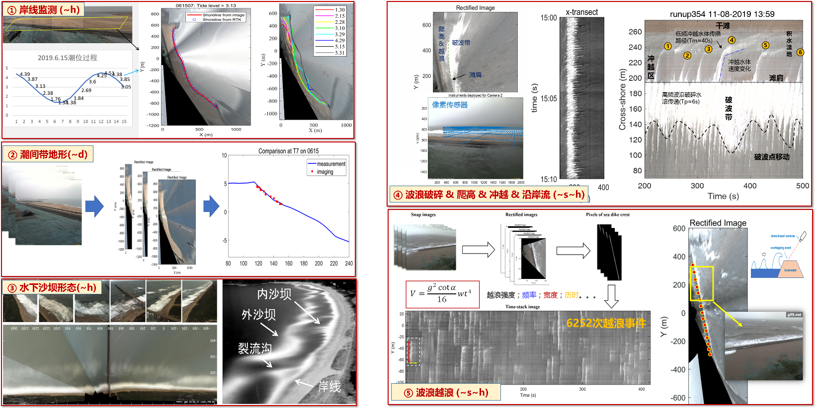 高清av 自主研发了新型海岸带岸基数字影像监测系统(COSVIMS),基于数字视频监控技术、影像分析技术和信号处理技术,以指定的时间表和2Hz以上的采样率,对空间范围1km以上的岸滩区域进行实时连续的数字影像和光学传感数据采集,可实时定量解析岸线位置、潮间带地形、沙坝形态、波浪破碎爬高越浪、水深反演、植被分布、人类活动轨迹等数据,空间分辨率可达cm~m,时间分辨率可达s~hr,实现了全天候、长期、连续、实时的海岸动力地貌和环境数据的准确监测。