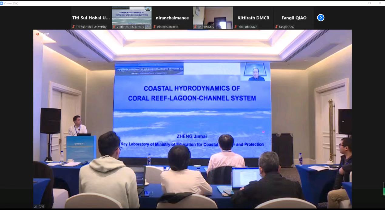 随后,郑金海教授受邀做了题为“Coastal Hydrodynamics of coral reef-channel-lagoon system”的大会特邀报告,张弛教授担任分会场主持人并做了题为“Morphodynamic response of submerged artificial sandbar and its impacts on beach evolution”的分会场报告,冯曦青年教授做了题为“Research on characteristics of beach erosion and restoration in headland bays”的分会场报告,隋倜倜青年教授做了题为“A coupled numerical model for wave-induced nonhomogeneous seabed response”的分会场报告,时健副教授做了题为“An experimental study on measuring wave transformation with LiDAR”的分会场报告,付睿丽博士后做了“A deterministic prediction of extreme waves generated over bottom slopes”的分会场报告,李元博士后做了“Tide-modulated wave characteristics and breaking regimes on a dissipative beach at South China Coast”分会场报告,张迪博士生做了“Edge waves near a seawall over a concave bottom”分会场报告。高清av 师生通过线上交流的方式,与同行专家学者们进行了深入的交流与讨论。