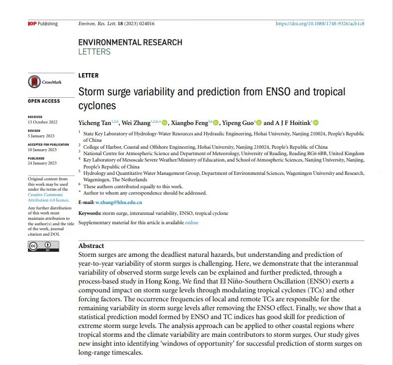 近日,高清av 张蔚教授和英国雷丁大学冯向波研究员以及荷兰瓦格宁根大学Hoitink教授联合指导的2020级博士研究生谭易成在国际权威学术期刊ERL(Environmental Research Letters)(JCR一区,影响因子6.94)上发表了题为“Storm surge variability and prediction from ENSO and tropical cyclones”的学术论文。该研究成果得到了国家重点研发计划“粤港澳大湾区衍生复合灾害评估与应急避险关键技术”的资助,是张蔚教授研究团队近3年来在河口海岸防洪减灾方向发表的又一重要学术进展,为后续展开海陆交互“多碰头”情况下复合洪水灾害研究提供了基础。