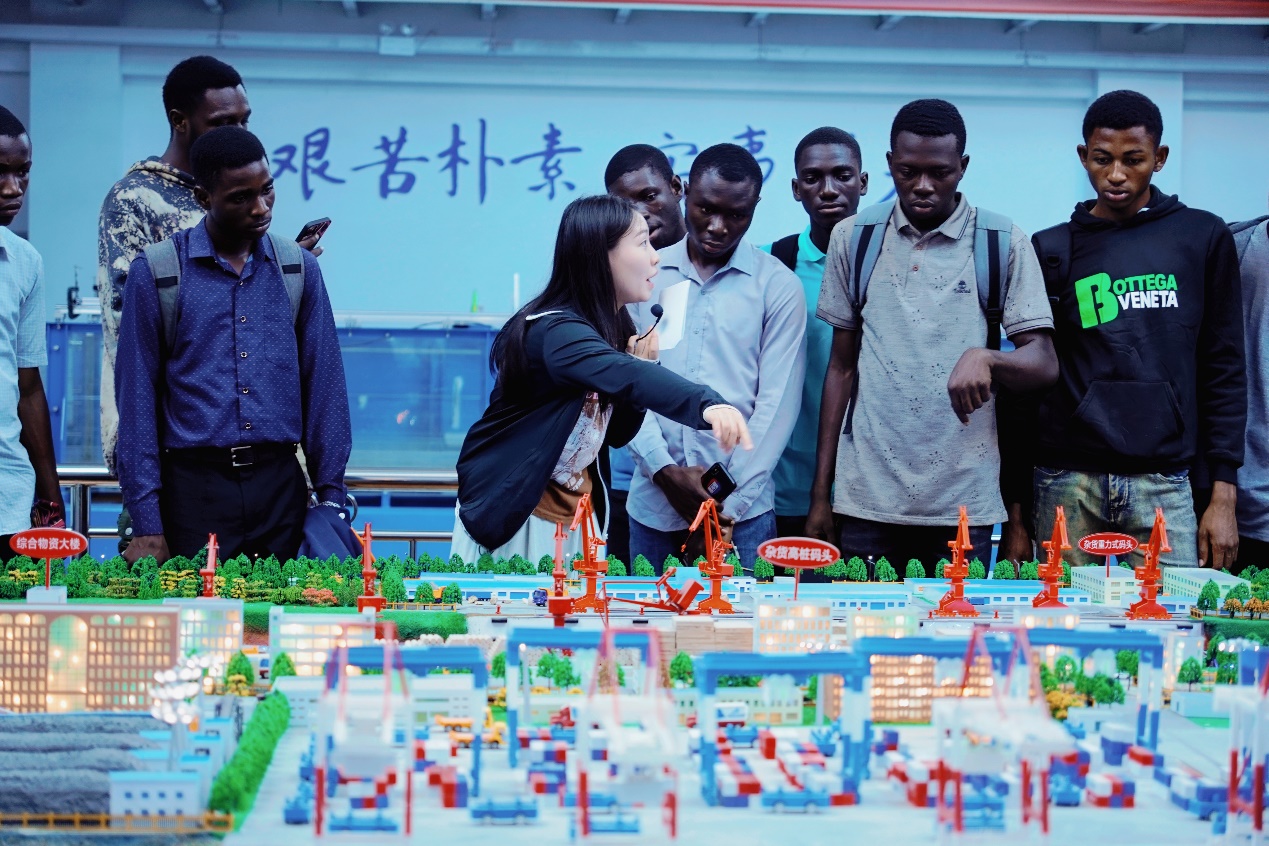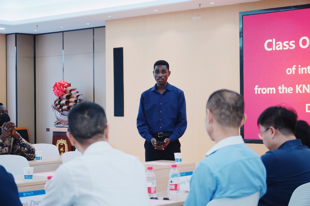张蔚副院长主持了此次开班典礼,并介绍了参会人员。陈红胜院长向留学生们介绍了2+2项目的相关政策,希望大家能珍惜2+2项目优厚的政策、优质的教学资源和良好的学习环境,全身心投入到专业知识学习中。龚政院长向留学生们介绍了高清av 的发展历史,希望大家能够积极融入学院,参与各项活动,同时也要注重课业,争取取得优异的成绩。留学生代表Kim Henry发言,代表来自KNUST留学生对高清av 提供2+2项目优厚政策表示衷心感谢,赞扬了学校为他们提供的难得学习机会,并表示将倍加珍惜这一学习机会,全身心投入到学业中。班导师张荷悦向留学生们介绍了港航专业的专业内涵、本科培养方案等,介绍过程中,学生们积极提问,现场气氛活跃。典礼后,系主任欧阳峰、辅导员王恒星、班导师张荷悦带领留学生们参观了港口航道与海岸工程综合演示平台,志愿者生动详尽地介绍了平台的各个细节,让留学生们对港航领域有了更为深入的了解。