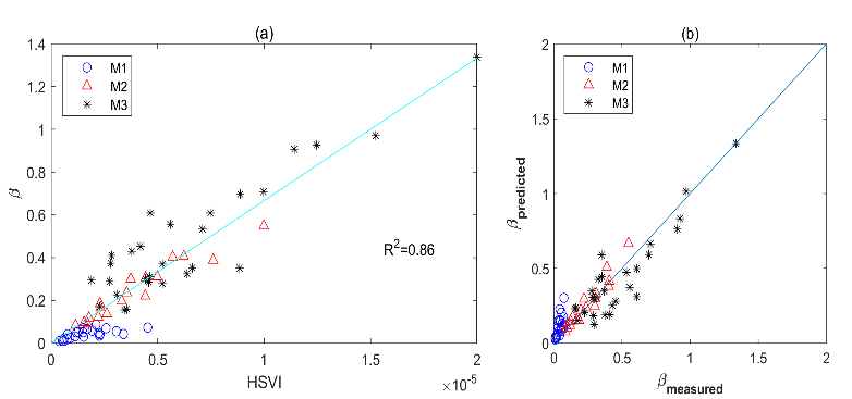 图3 红树林水动力淹没体积因子HSVI与波高衰减系数β的相关关系