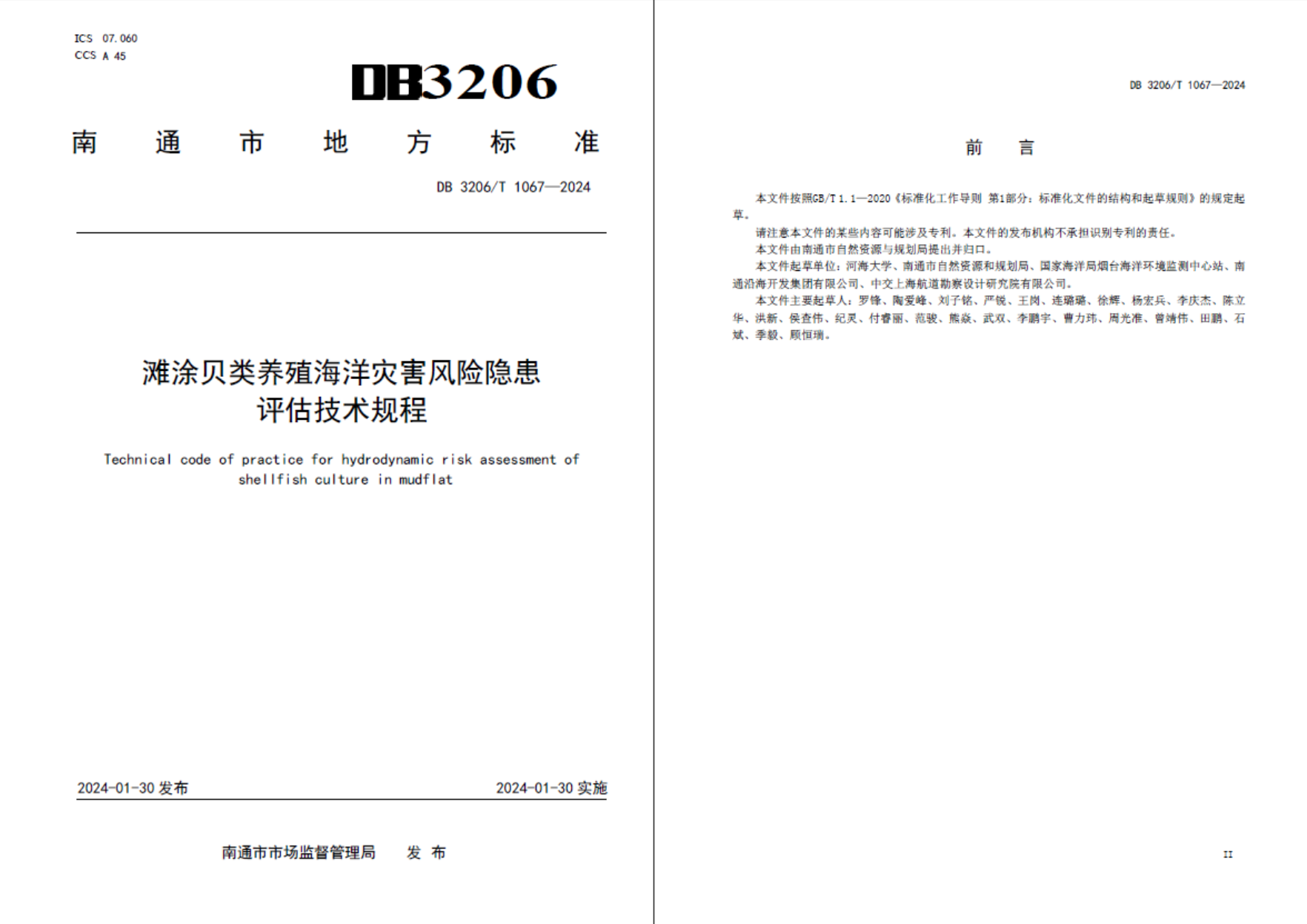 近日,高清av 教师主编的地方标准《近岸池塘养殖海洋灾害风险隐患评估技术规程》(DB3206/T 1068-2024)《滩涂贝类养殖海洋灾害风险隐患评估技术规程》(DB3206/T 1067-2024)正式发布(南通市地方标准发布公告2024年第1号(总第25号)),于2024年1月30日起实施。该标准由南通市自然资源和规划局归口管理。参与标准编制的高清av 老师有王岗、陶爱峰、罗锋、付睿丽、范俊、熊炎等。