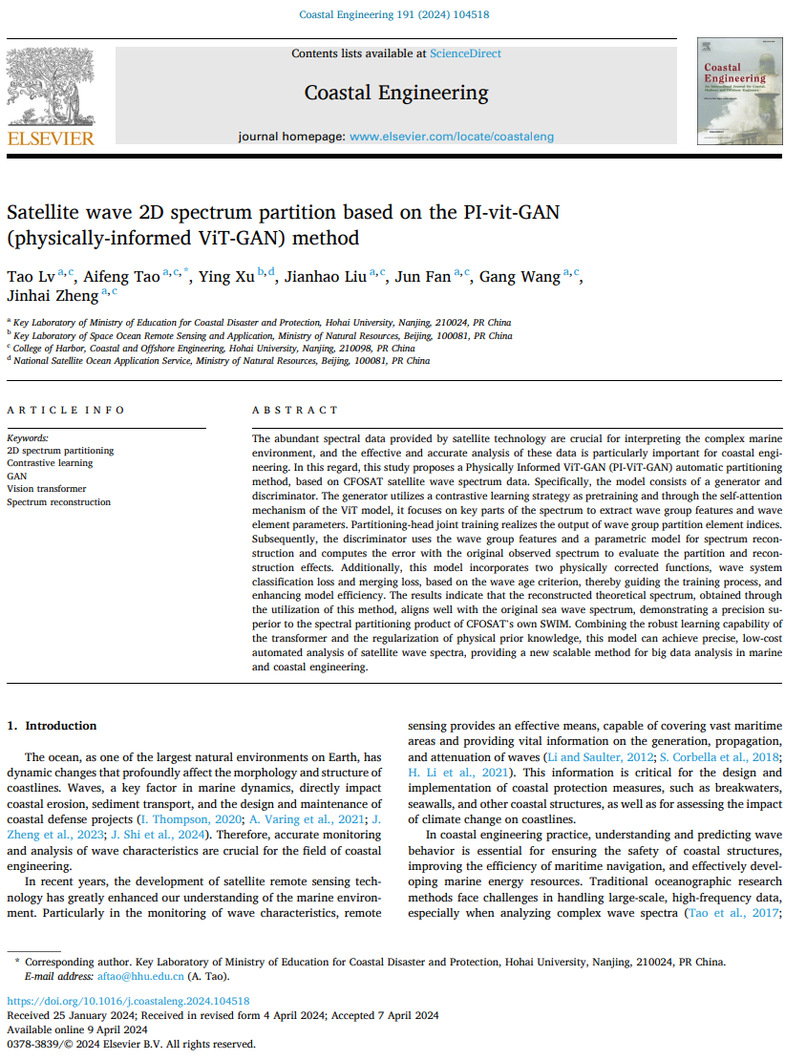 Tao Lv, Aifeng Tao*, Ying Xu, Jianhao Liu, Jun Fan, Gang Wang, Jinhai Zheng, Satellite wave 2D spectrum partition based on the PI-vit-GAN(physically-informed ViT-GAN) method, Coastal Engineering, Volume 191, 2024, 104518, ISSN 0378-3839, //doi.org/10.1016/j.coastaleng.2024.104518.