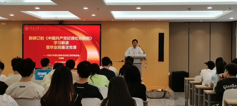学院党委书记张雪刚以“新修订的《中国共产党纪律处分条例》学习解读暨毕业班廉洁党课”为题,从三方面讲授专题党课:一是《条例》学习解读,通过回顾党的纪律建设历程,深刻认识开展党纪学习教育的目标要求;学习习近平总书记关于加强党的纪律建设重要论述,强调进入新时代以来,习近平总书记对于加强党的纪律建设的高度重视,体现了中国共产党不断自我革新、永葆活力的决心与行动;从六大纪律及相关处置条例切入,解读《中国共产党纪律处分条例》,分析《条例》的历史沿革、科学内涵、实践要求。二是廉洁自律要求,围绕加强廉政理论学习、提高反腐倡廉能力,严格心里底线、坚守反腐倡廉原则展开阐述,通过毕业生初入职场抵制各类诱惑、坚守初心的实际案例,教育毕业生党员廉洁修身、廉洁从业。三是老师对同学们的期盼,以“坚守规则、敬畏权力;坚守孝道、关爱亲人;坚守友情、桃花潭水;低调做人、牢记感恩;身心健康、前程似锦”寄语毕业生党员。