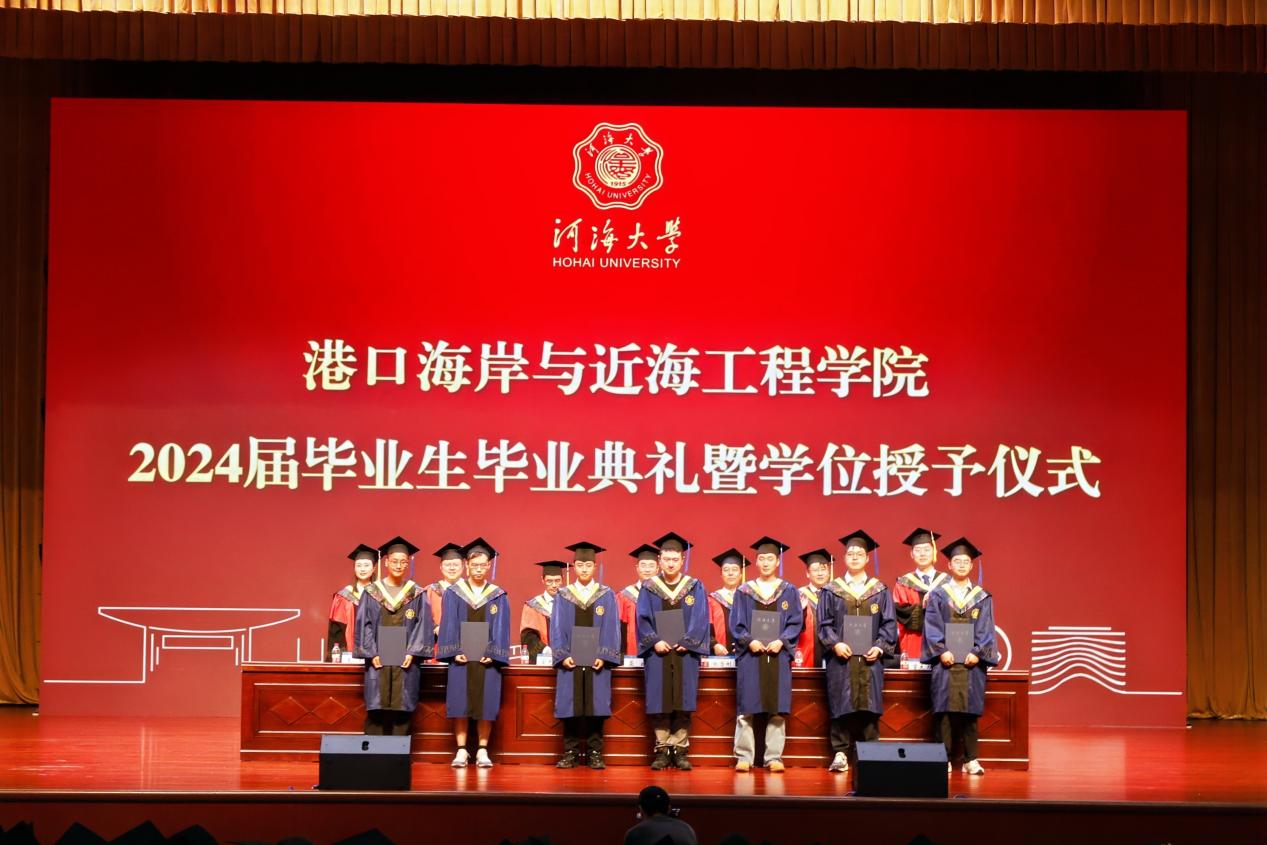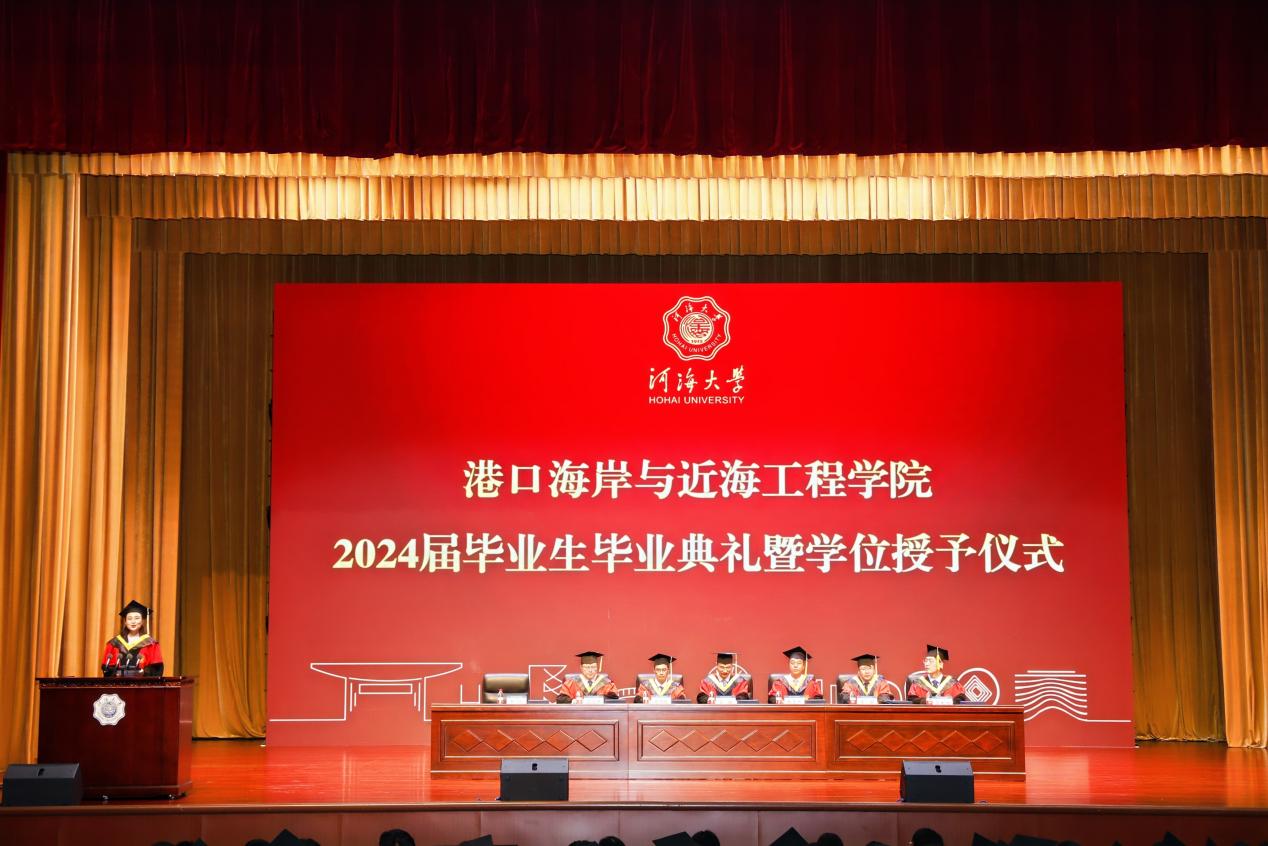 6月21日下午,高清av 2024届毕业生毕业典礼暨学位授予仪式在河海会堂隆重举行。典礼特邀中交第三航务工程局有限公司及分公司代表出席典礼,高清av 院长龚政教授向毕业生寄语,高清av 党委书记张雪刚,大禹学院副院长、党委副书记金光球,高清av 副院长张蔚、陈永平、管大为,各系所负责人、班导师代表、全体辅导员,2024届毕业生及部分家长代表参加典礼,典礼由高清av 党委副书记王玲主持。