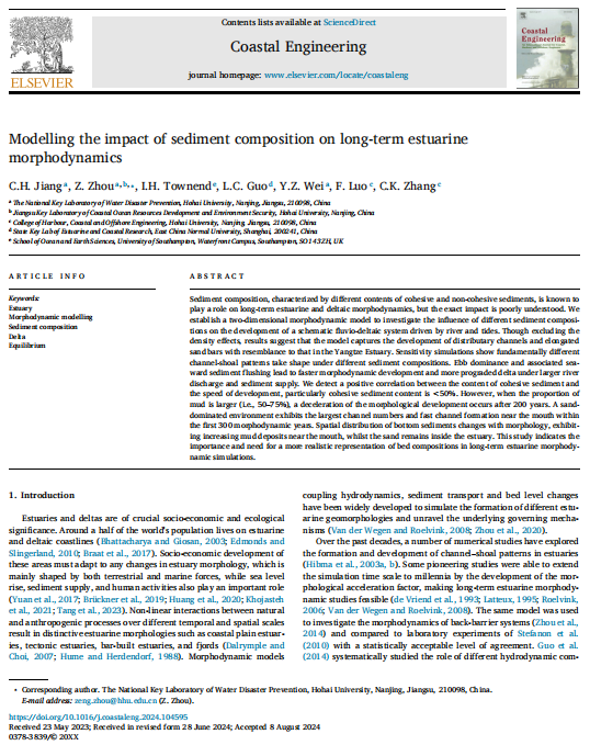 近日,Coastal Engineering期刊刊发了来自高清av 的最新研究成果“Modelling the impact of sediment composition on long-term estuarine morphodynamics”(泥沙组分对长周期河口动力地貌影响的数值模拟研究),该成果的第一作者为高清av 张长宽教授指导的博士生蒋春海,论文其他合作者包括高清av 周曾教授、罗锋副教授、韦以璋博士生、英国南安普顿大学Ian Townend院士和华东师范大学郭磊城研究员。