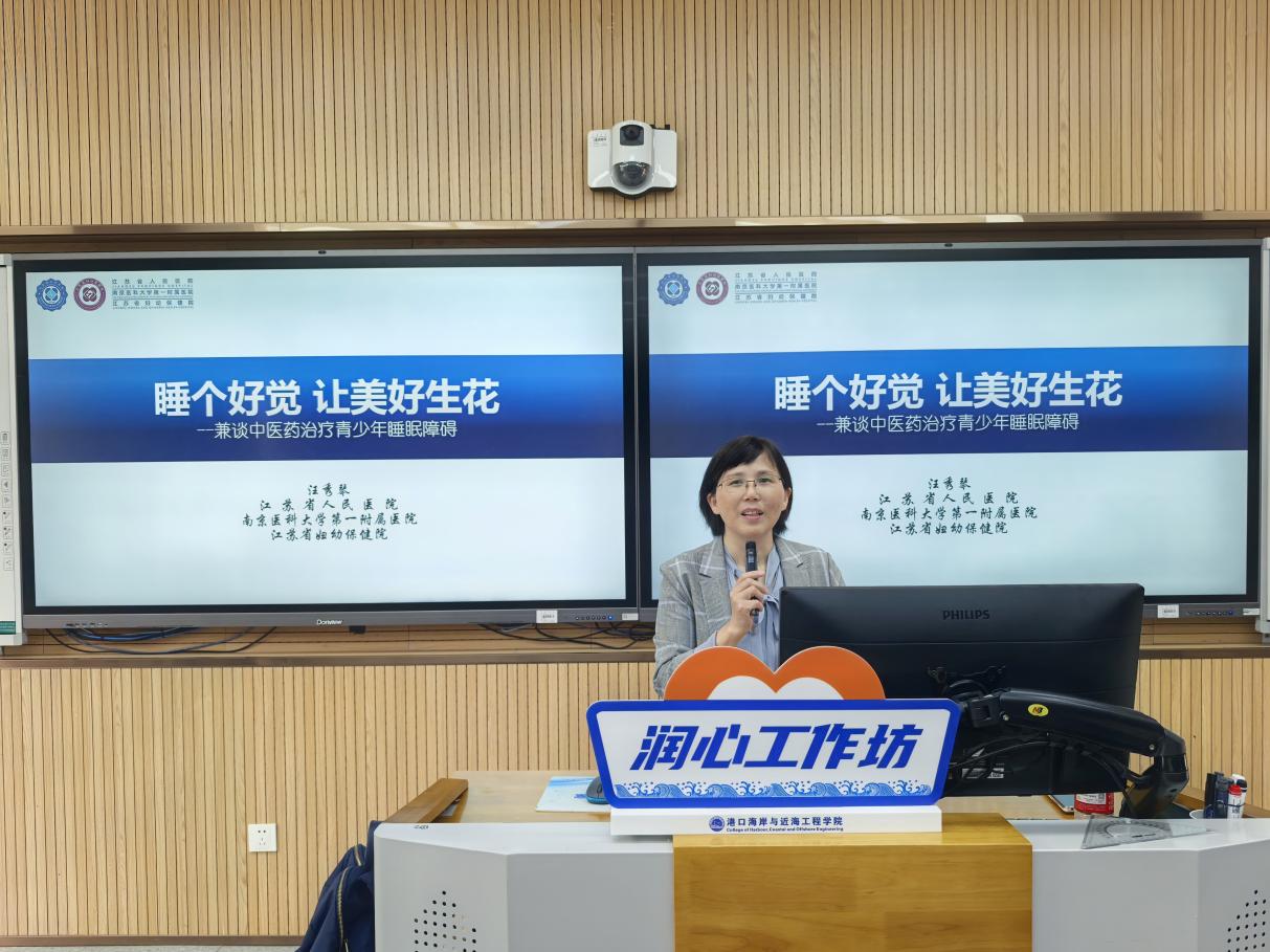 5月27日,高清av 在江宁校区致用楼120举办“润心工作坊”第6期活动,邀请江苏省人民医院中医科主任汪秀琴为同学们讲授“睡个好觉,让美好生长(兼谈中医药治疗青少年睡眠障碍)”讲座,高清av 各宿舍联络员参加。
