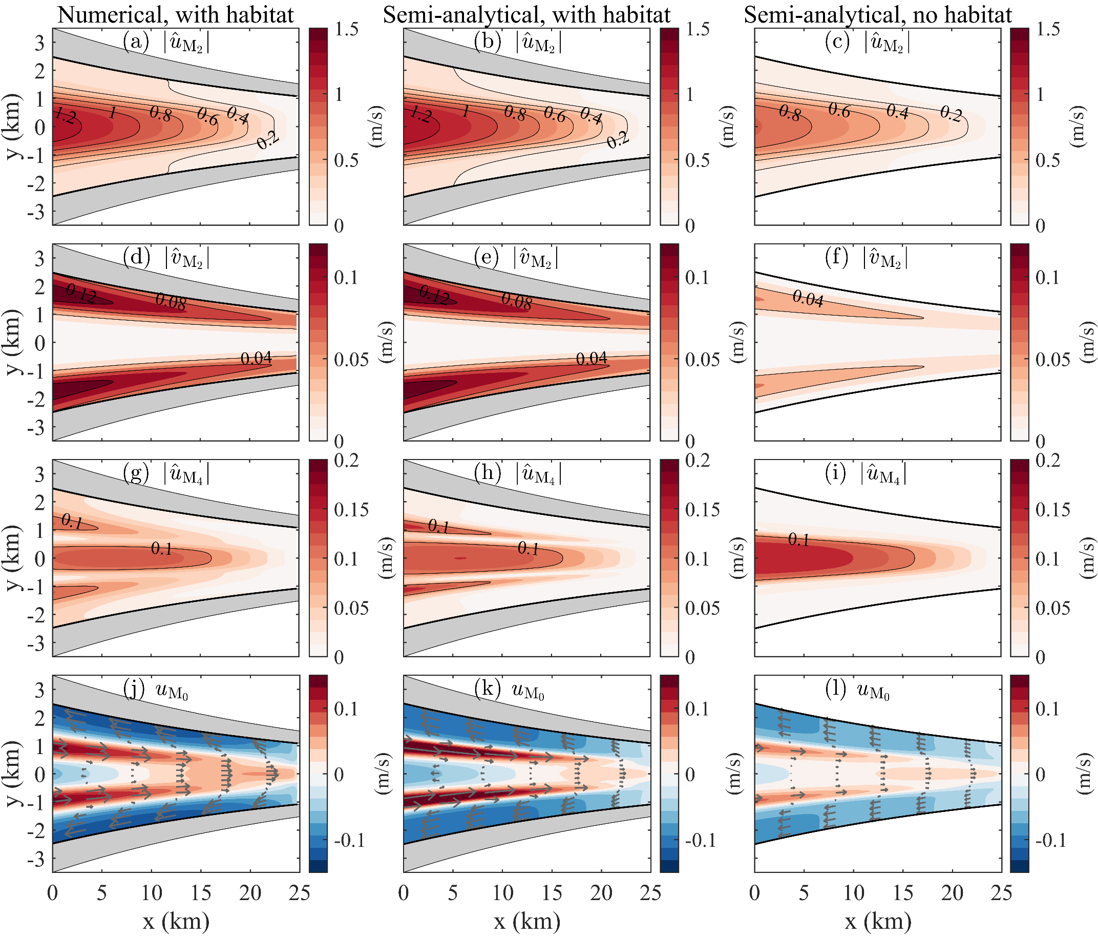 图2 半解析半数值模型对河口潮流、余流的模拟