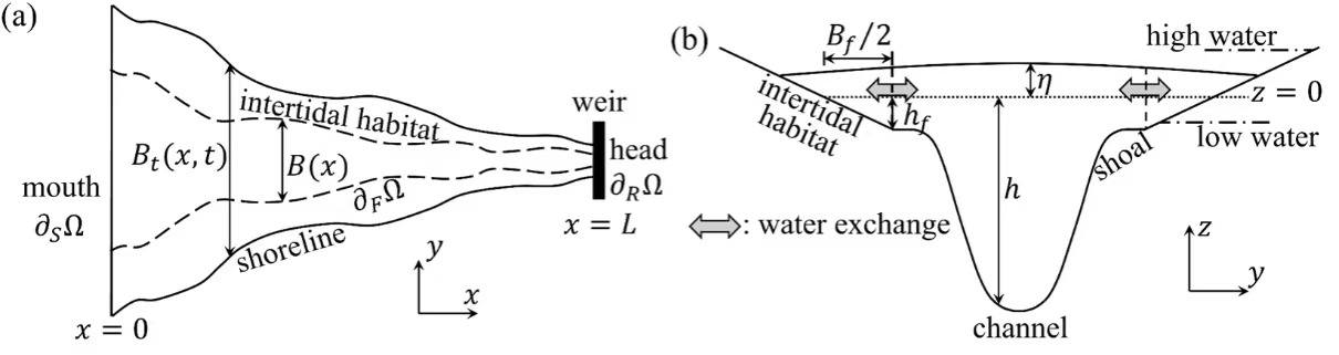 潮滩是河口的重要生态系统,在改善水质、调节气候变化以及提供海岸防护方面具有关键作用。然而,受人类活动与气候变化等多重因素影响,全球潮滩面积正迅速缩减,这不仅显著改变了河口动力过程,也对河口生态环境构成严重威胁。尽管如此,河口滩槽动力互馈机制仍尚不清晰,这显著限制了我们对当前及未来人类活动和气候变化影响的有效评估与预测。为此,本研究构建了首个覆盖潮间带-浅滩-深槽的半解析半数值三维水动力模型,能够分离并解析控制河口动力的各个物理过程,以揭示滩槽水体之间的相互作用机理(图1)。