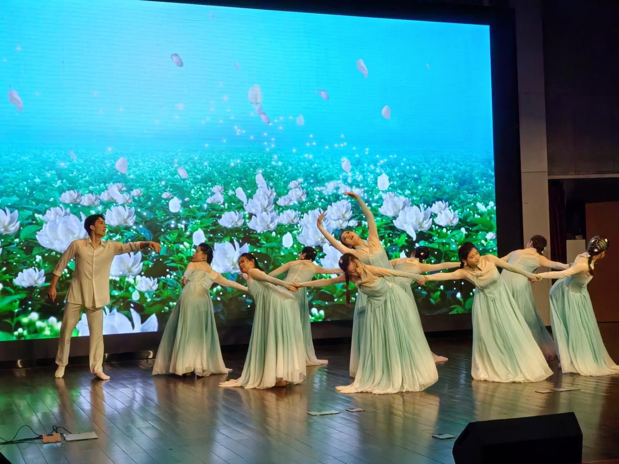 首先,研学团欣赏了由高清av 大学生艺术团表演的舞蹈《茉莉吟》。他们的青春正如茉莉花一般,纯洁而充满活力,在这片热土上绽放,带领着同学们随着舞者轻盈的舞步,重温这片充满诗意的江南水乡。高清av 大学生艺术团是校内综合性艺术组织,包含多个艺术方面,多次在比赛中获得好成绩,其中舞蹈团更是作为省级艺术团,在大艺展中荣获一等奖。