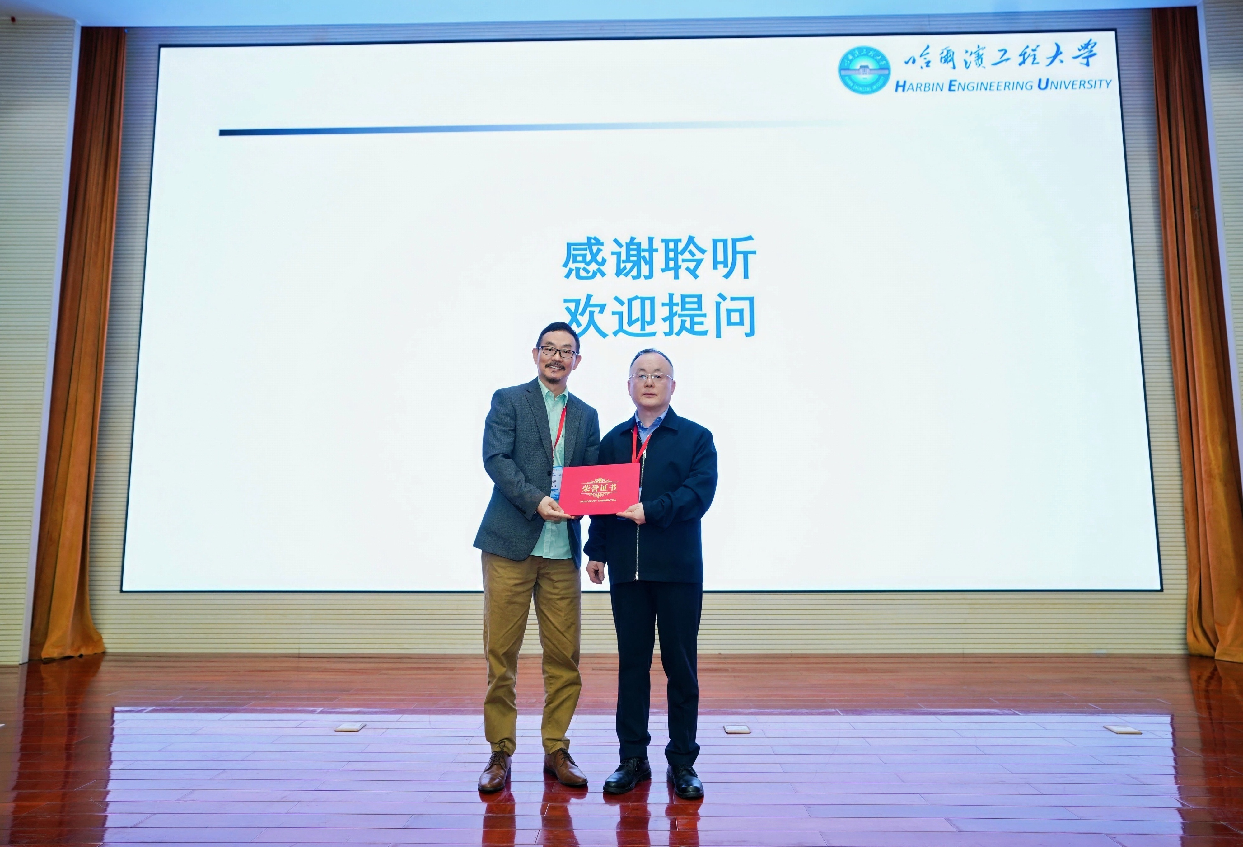 大会报告环节,中国科学院院士、宁波东方理工大学校长陈十一教授,哈尔滨工程大学南安普顿海洋工程联合学院院长段文洋教授,高清av 薛米安教授,大连理工大学赵云鹏教授,中国科学院力学研究所超常环境非线性力学全国重点实验室主任王士召研究员,德国杜伊斯堡-埃森大学蒋长青副研究员应邀分别作题为《CAE+AI的进展与挑战》、《船舶水动力自由面格林函数时域边界元稳定性》、《液舱晃荡及其对海工结构振动的调控机理》、《典型深远海养殖设施水动力学关键问题研究》、《潜航器湍流大涡模拟与FW-H方程的声源计算》、《基于CFD与数据驱动的系泊浮体流固耦合分析方法》的大会报告,哈尔滨工程大学张阿漫教授、高清av 陶龙宾教授、西安建筑科技大学赵祥模教授、中国船舶及海洋工程设计研究院王金宝研究员、中国船舶科学研究中心马峥研究员、高清av 张继生教授依次主持了上述大会报告并为大会报告专家颁发了荣誉证书。会议还设置了8个分会场,包括主题报告18篇,交流报告163篇。