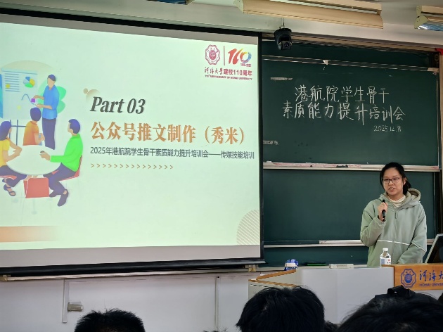 为帮助学生组织骨干快速适应学生组织工作,提升综合素质与实务能力,12月8日上午,高清av 在高清av 江宁校区致高楼B201举办了“高清av 学生组织骨干素质能力提升培训会”。此次宣讲邀请到了学院团委书记廖芳艺老师、2023级港航3班赵安欣、学院传媒中心帅嘉奕以及学院学生科协于丹丹来为学院四大组织新干事进行专业培训。