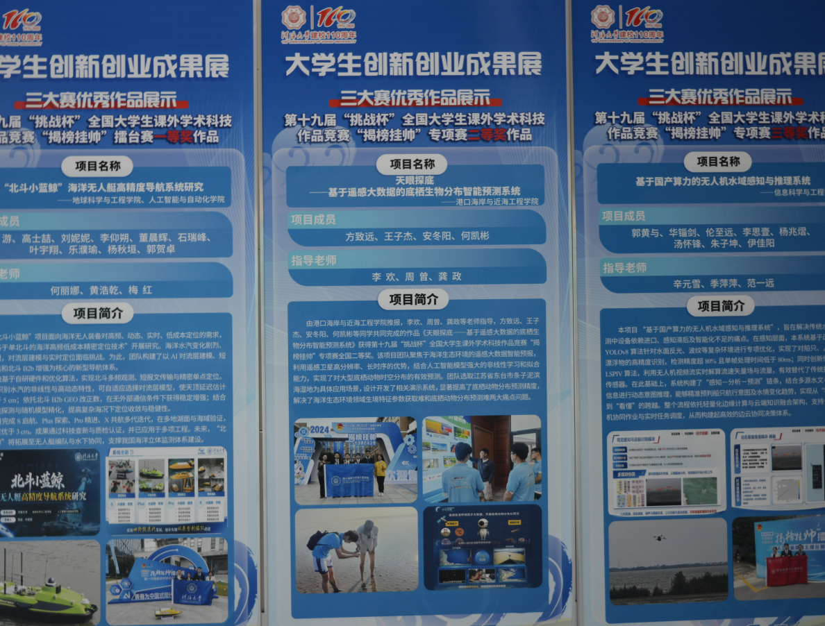 在创新创业成果展现场,高清av 设置专门展区,重点展示国家级竞赛获奖作品及优秀创新训练项目。“三大赛”展区中:《深海哨兵——海上风机多点位冲深智能预警预报系统》获第十九届“挑战杯”全国大学生课外学术科技作品竞赛“揭榜挂帅”擂台赛擂主、特等奖;《天眼探底——基于遥感大数据的底栖生物分布智能预测系统》获赛事“揭榜挂帅”专项赛全国二等奖,《智慧粒子海工冲刷预警预报系统》获该竞赛全国三等奖。在中国国际大学生创新大赛中,《仓潮智行——海工级无人艇智能装备产业化开拓者》在国创赛(2025)中摘得全国银奖。此外,在大学生创新训练项目板块,《河道岸线资源高效利用评价体系研究与应用》《新型亲水性海堤防浪墙设计及波浪力研究》两项项目获评2025年结题优秀国家级创新训练项目。