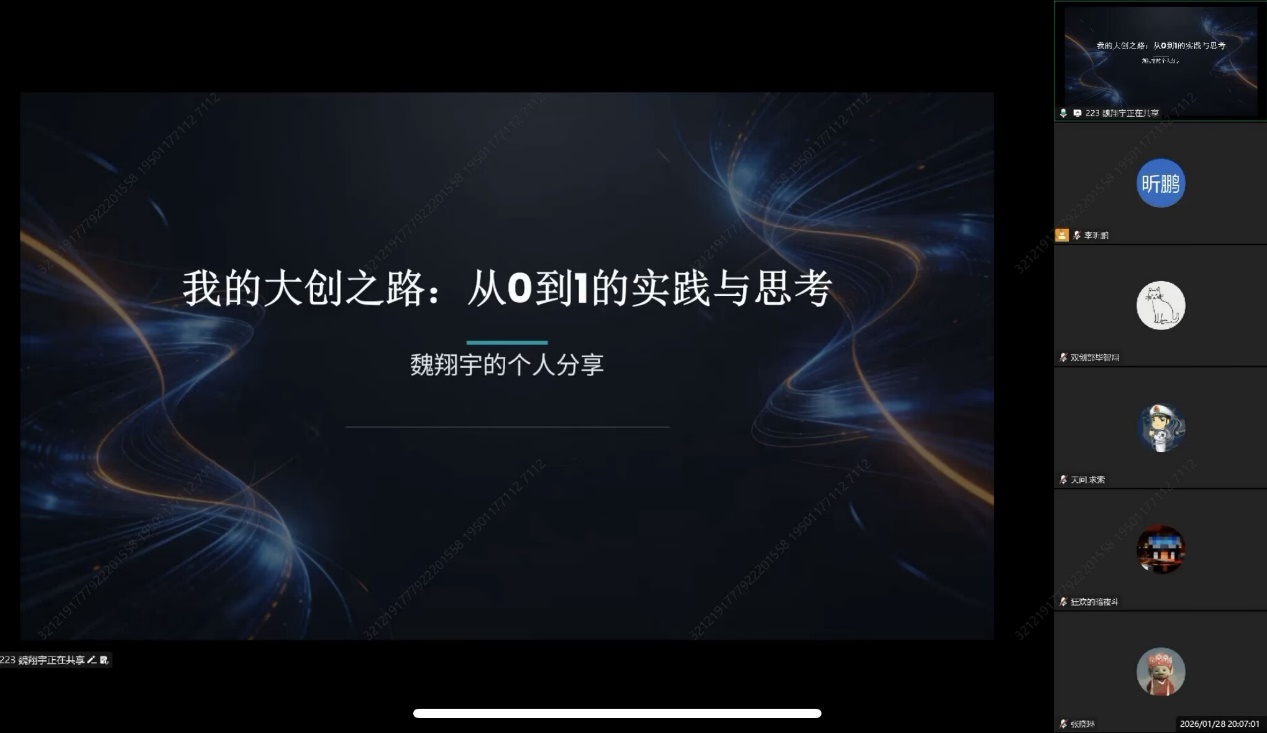 为积极引导学生尽早加入科研团队开展科学研究,促进高水平科研优势向一流人才培养转化,推动学科交叉融合下的创新创业实践能力培养,高清av 在寒假期间开展线上高清av 大学生创训宣讲会,特邀往届优秀团队负责人魏翔宇于1月28日通过腾讯会议进行,旨在分享科研经验、搭建交流平台,激发学生科研热情,助力创新创业能力的全面提升。